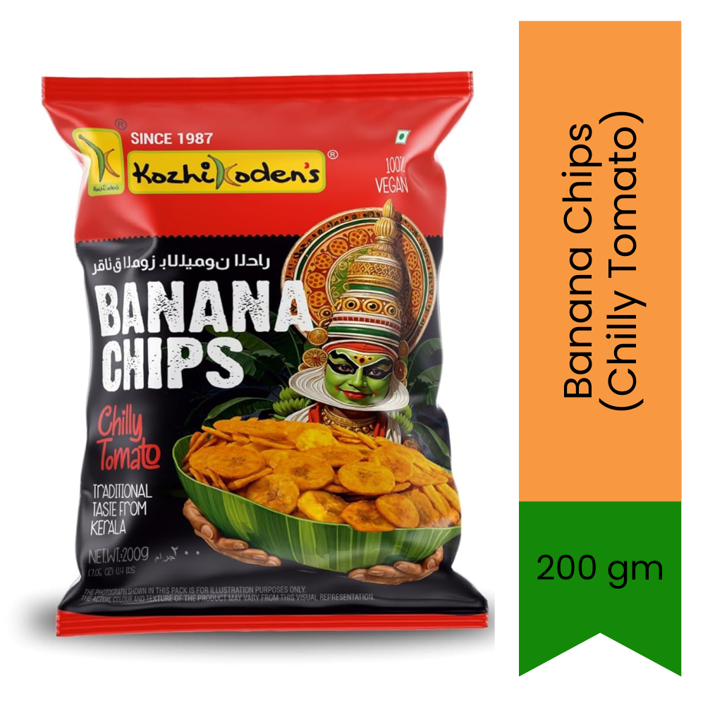 UNIQUE FLAVOR FUSION FROM KOZHIKODEN'S – Experience the bold and unforgettable taste of Kozhikoden’s Chilli Tomato Banana Chips, combining sweet bananas with spicy chili and savory tomato for an exceptional snack
