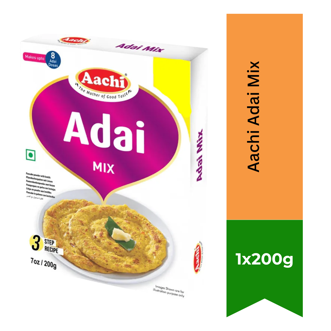 Take 200 gms Aachi Adai Mix, add 300ml of water and mix well. Keep aside for 15 minutes and prepare Adai on dosa pan. Serve hot with any chutney. To enhance the taste, fry curry leaves, sliced onion and sliced coconut pieces in gingelly oil and mix well with adai mix.