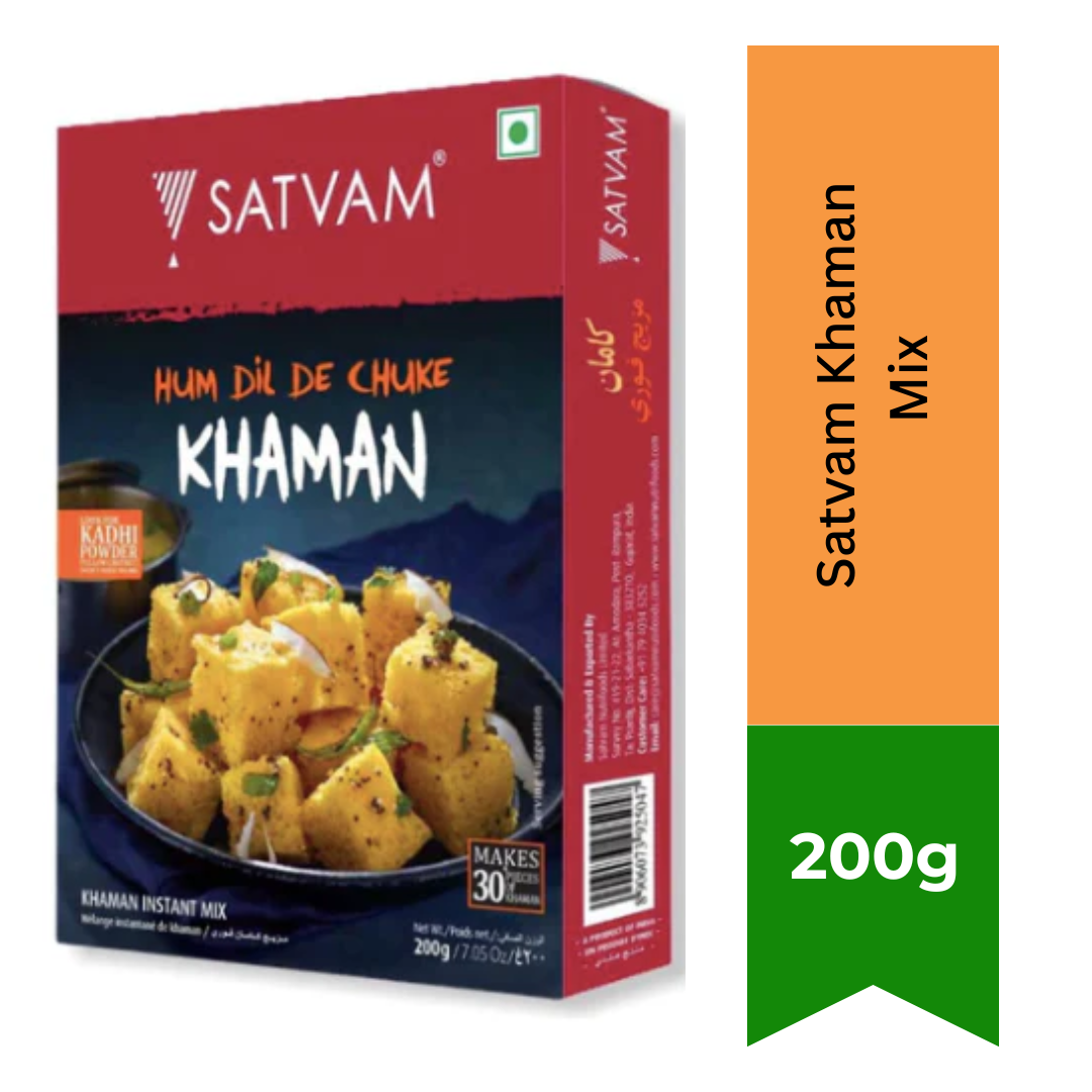 - Khaman Recipe:Â Cut Satvam Khaman Mix pack from top and remove the sachet which is inside the Khaman mixture. Add the Khaman mixture into a bowl containing 330 ml of water and stir well. Keep the mixture aside for 5 mins. Dissolve the contents of the sachet in 70 ml of water and immediately add it to the above mixture.