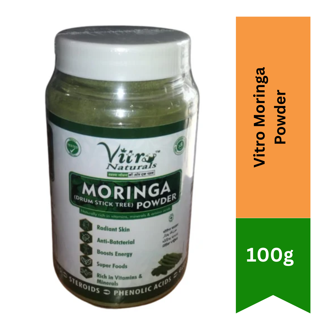 Vitro Moringa powder contains leaf powder of Moringa Oliefera (Sahjan). The powder is produced by harvesting, drying then milling the leaves of Moringa Oleifera. The powder is extremely rich in nutrients. It contains 90 +nutrients and 40+ antioxidants.