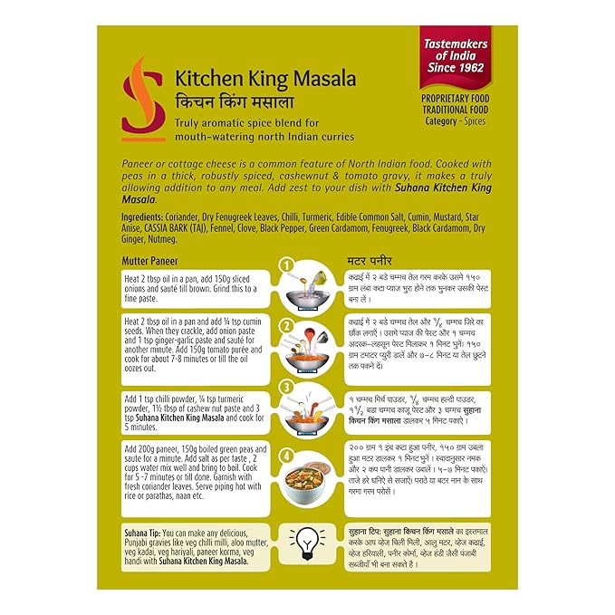 Perfect for dishes like mixed veg curry, paneer masala, or dal fry – just a spoonful of Suhana Kitchen King brings your food to life. Trusted by Indian households and chefs alike!