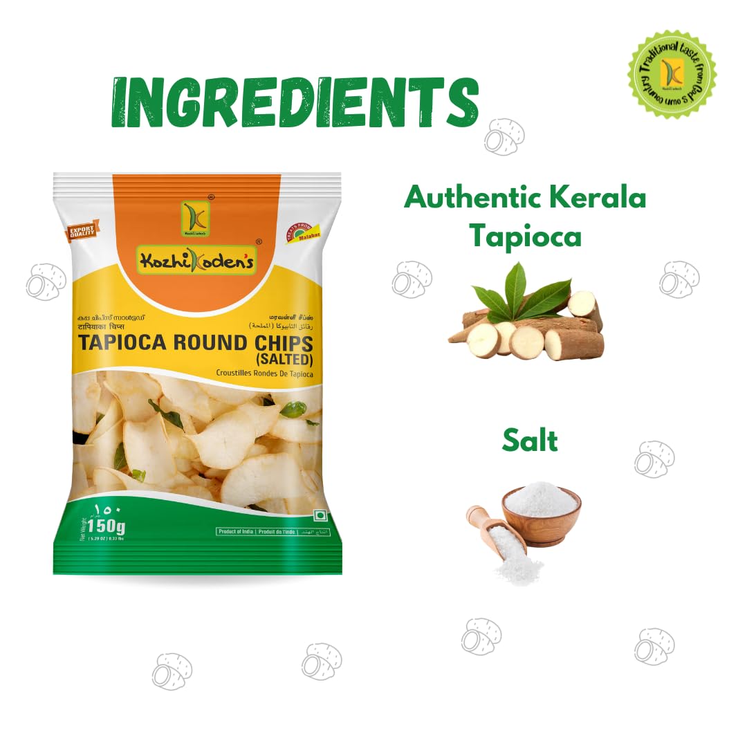 - Authentic Kerala Flavor: Enjoy the rich, traditional taste of South Indian snacks with Kozhikodens Tapioca Round Salted Chips.