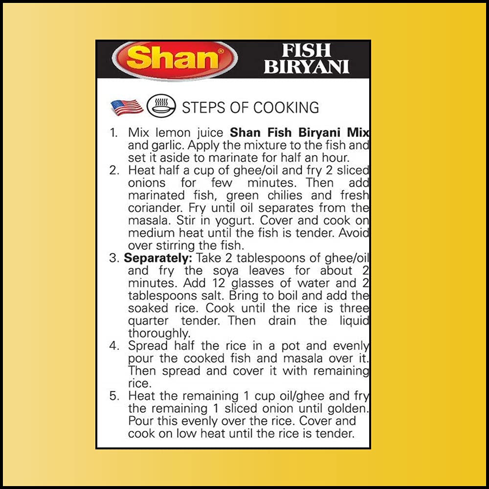 • About the Product: Expertly crafted by Shan, this premium recipe mix is tailored for seafood biryani—enhancing fish without overpowering it, ensuring authentic taste with effortless cooking.