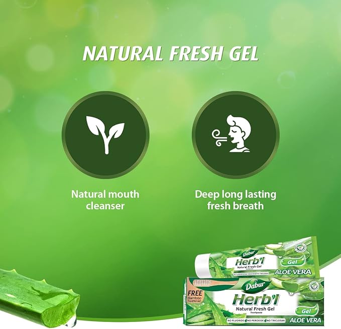 Experience the soothing benefits of aloe vera with Dabur Herbal Natural Fresh Gel Toothpaste, specially formulated to care for sensitive teeth and delicate gums. This refreshing gel combines the healing properties of aloe vera with potent herbal extracts to deliver effective cleaning while maintaining gentle protection. The natural formula neutralizes acids, prevents plaque buildup, and leaves your mouth feeling fresh and revitalized. Ideal for those who prioritize natural ingredients and gentle care, this 150g tube makes oral hygiene a rejuvenating experience. Included complimentary toothbrush ensures you're fully equipped to embrace a healthier smile today.