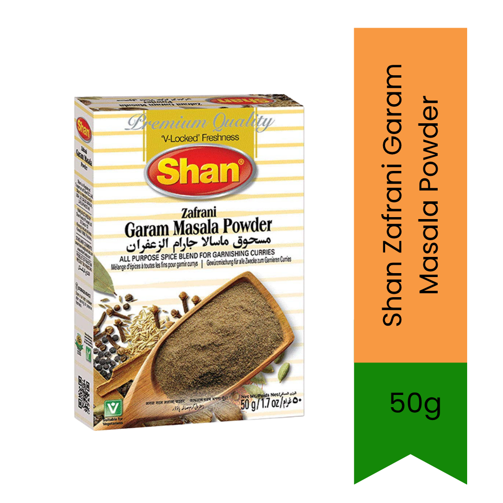 About the Product – Shan Zafrani Garam Masala Powder is a premium, export-quality blend enriched with zafran (saffron) for a rich aroma and authentic taste.